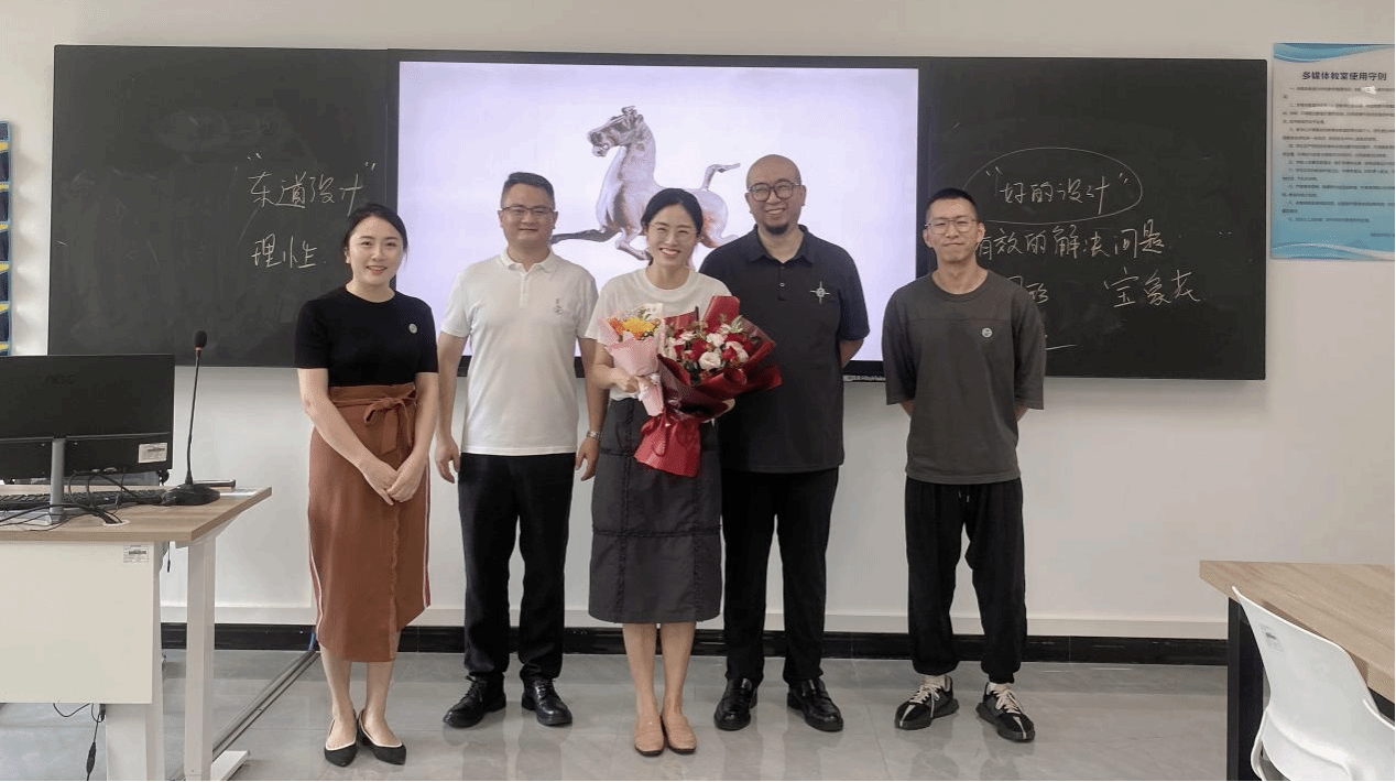 经理朱亚明、副经理马乐、工会主席彭丽、办公室主任易欣与教师合影
