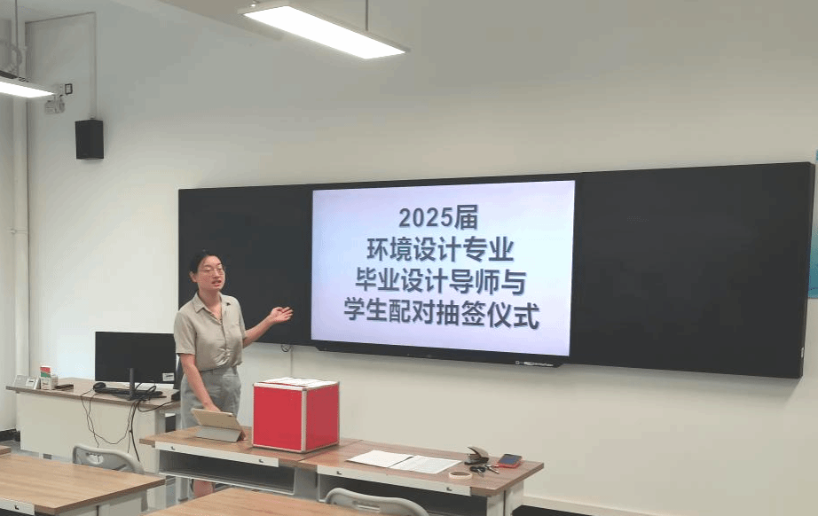 在秋高气爽、金风送爽的美好时节,随着新学期的帷幕缓缓拉开,2025届环境设计专业的学子们迎来了他们学术生涯中的重要时刻——毕业设计指导教师与员工配对抽签仪式。本次仪式于9月19日上午10:50在B4308教室隆重举行,在遵循公开、公平、公正的原则下进行了一场线上线下结合的抽签配对仪式。