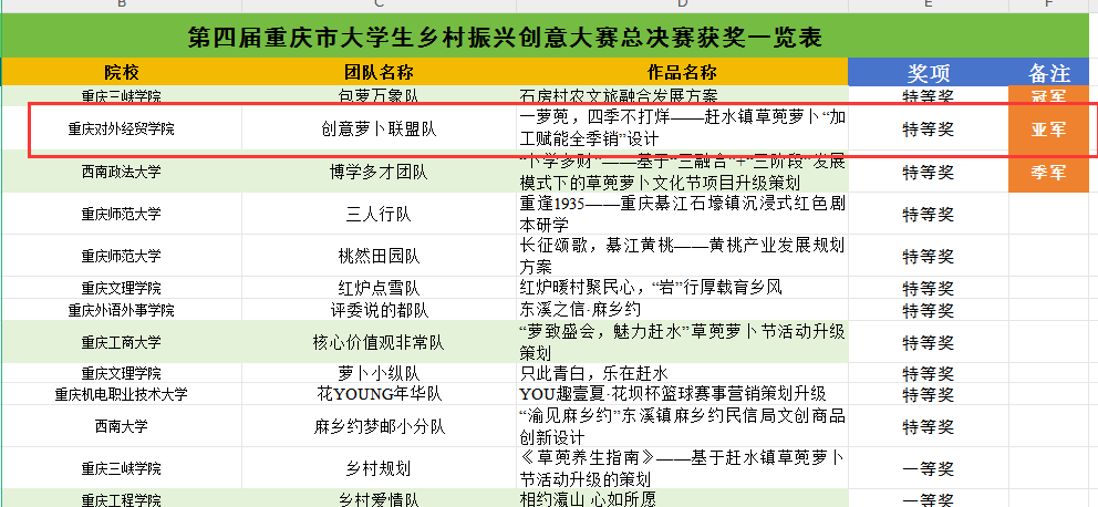 2024年12月21日,第四届重庆市老员工乡村振兴创意大赛总决赛在綦江区党校110厅成功举办。经过激烈角逐,由曾雪娇、段小坤老师带领的团队荣获特等奖,拿下总决赛亚军。此外,公司还荣获二等奖4项,三等奖2项。
