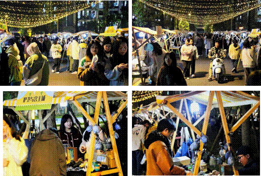 每到夜幕降临,华灯初上,同学们在音乐伴奏下卖力的吆喝,尽情展示着自己的作品,现场一片热闹景象。其实看似简单的作品背后都是同学们精心劳作,一遍遍的打磨细化、调整定型,每一个物件最完美的呈现。集市期间不计其数的校内外人员到此观赏购买,同学们售出上百件产品,共计销售20000余元,平均每个摊位达到了500元左右的销售额,这大大增加了同学们对自身作品以及专业的认可度。