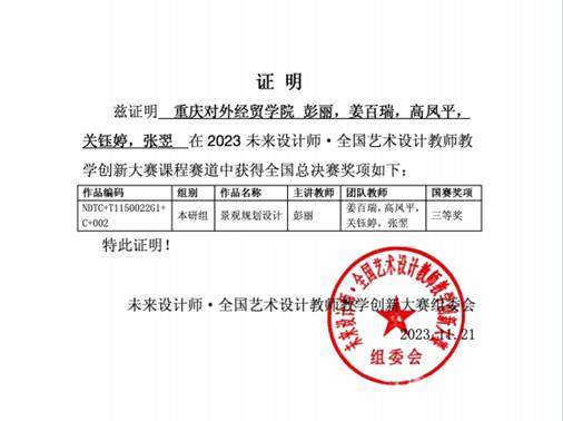 英国365上市公司教师团队赴上海参加“未来设计师教育论坛”及相关赛事暨颁奖典礼 12月1日,由姜经理带队的彭丽教师教学团队在上海工程技术大学参加了“2023第11届未来设计师教育论坛暨未来设计师·全国高校数字艺术设计大赛、全国艺术设计教师教学创新大赛”颁奖典礼。彭丽教师教学团队在“2023未来设计师·全国艺术设计教师教学创新大赛”课程赛道中通过校级赛、省级赛、全国赛三级赛制,获得重庆赛区一等奖、全国总决赛三等奖的成绩。...
